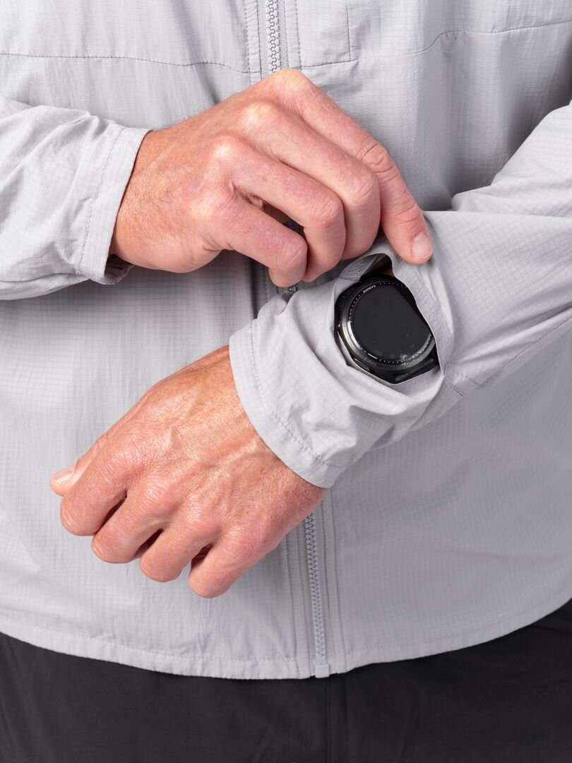 Anatomicky tvarované rukávy zakončené do gumy zajišťují pohodlný pohyb, otvor na hodinky umožňuje snadné sledování času či sportovních dat. Bunda kombinuje nízkou hmotnost, funkčnost a praktičnost v jednom.